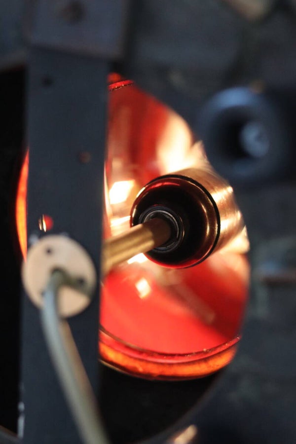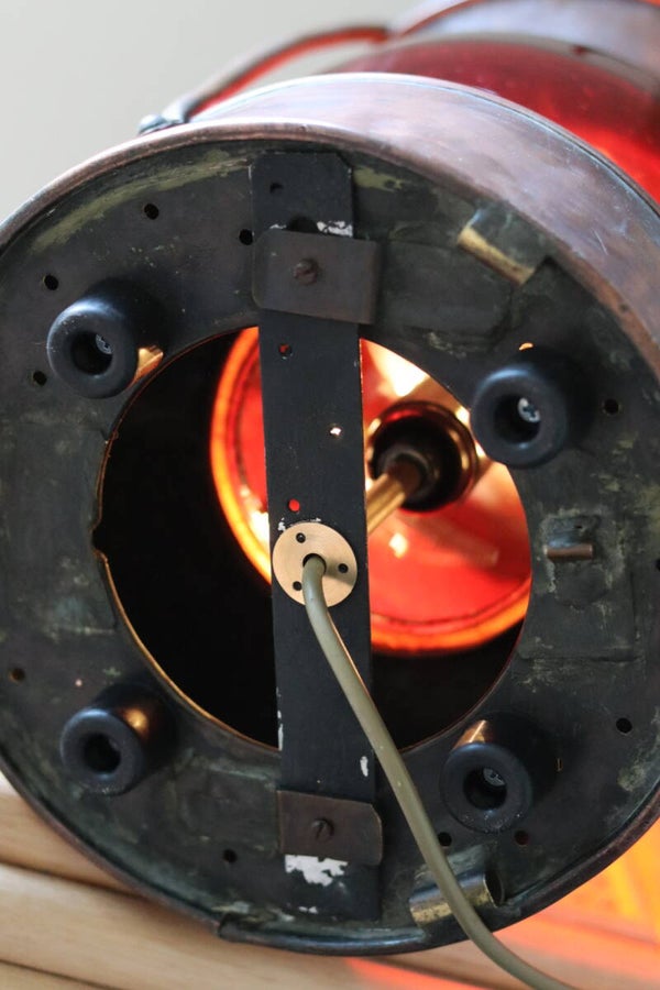 The lid is soldered closed, look closely at the photos for the condition. Glass looks a bit orange when it's on, but it's really red.